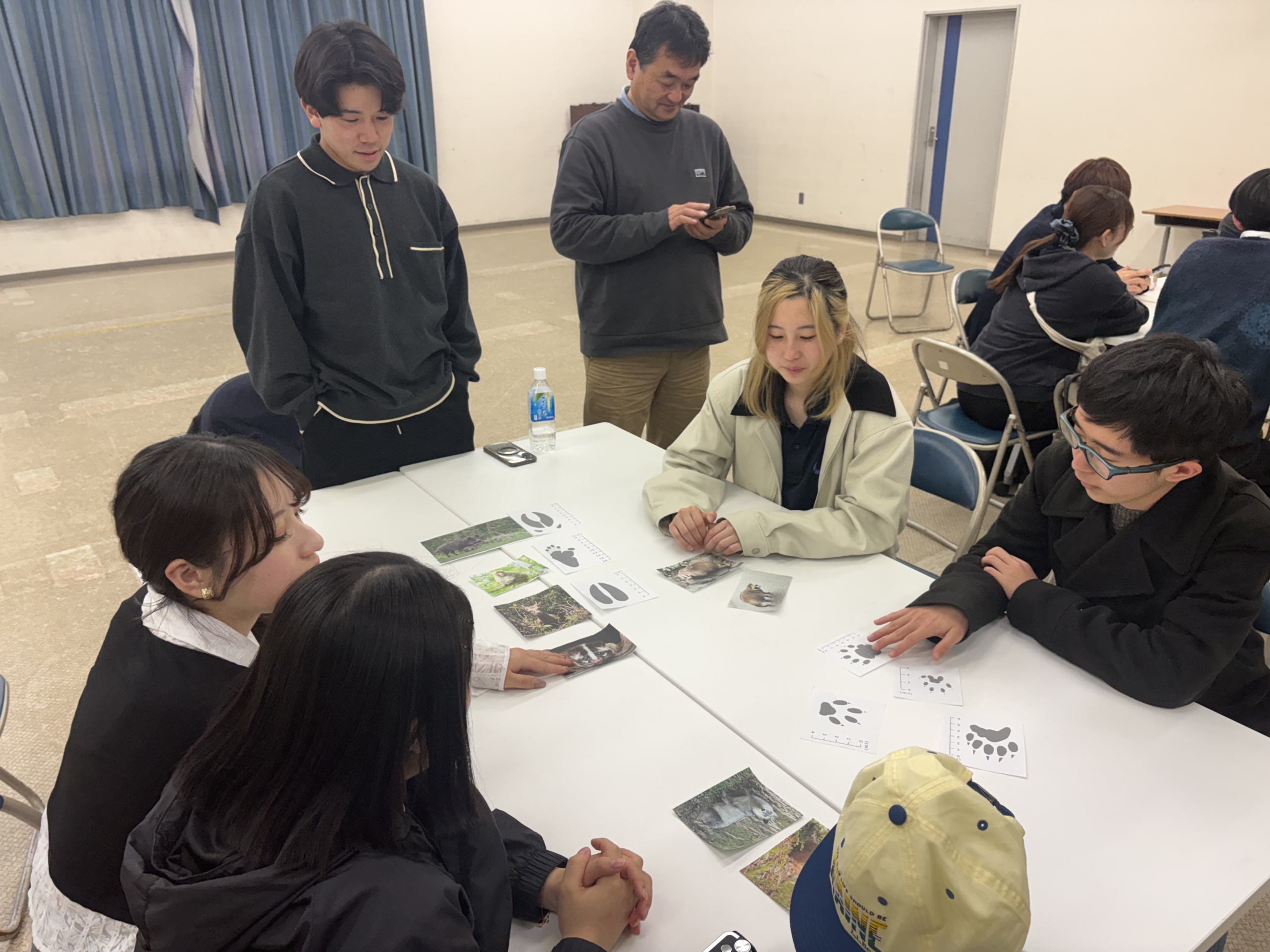 その後のフィールドワークでは、実際に町を歩きながら足跡や糞などの痕跡を観察しました。座学で得た知識が現地の環境と結びつくことで、「この場所に動物が存在している」という実感が生まれ、理解が一層深まりました。