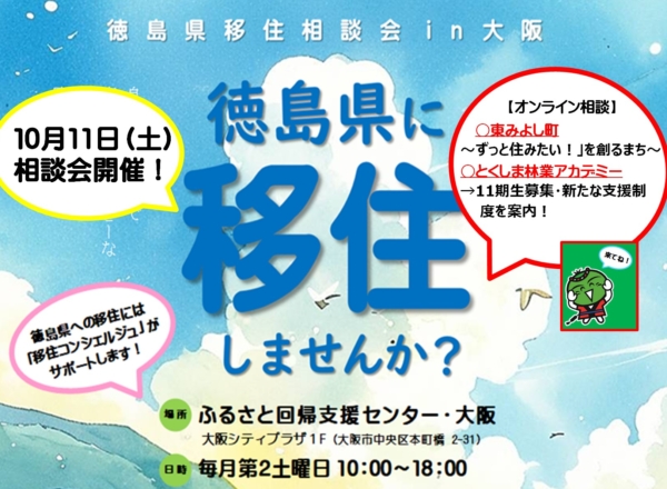 10月11日(土)「徳島県移住相談会in大阪」 開催!(オンライン参加:東みよし町・とくしま林業アカデミー)のお知らせ!